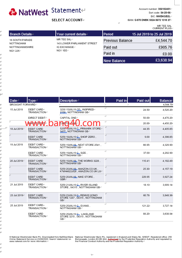 英国国民西敏寺银行对账单 Word 和 Pdf 模板用于: