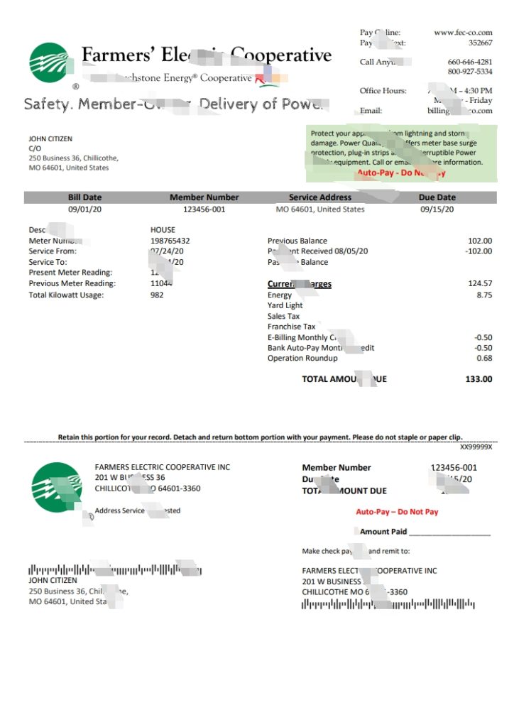 美国俄亥俄州农民电力合作社公用事业账单模板用途: