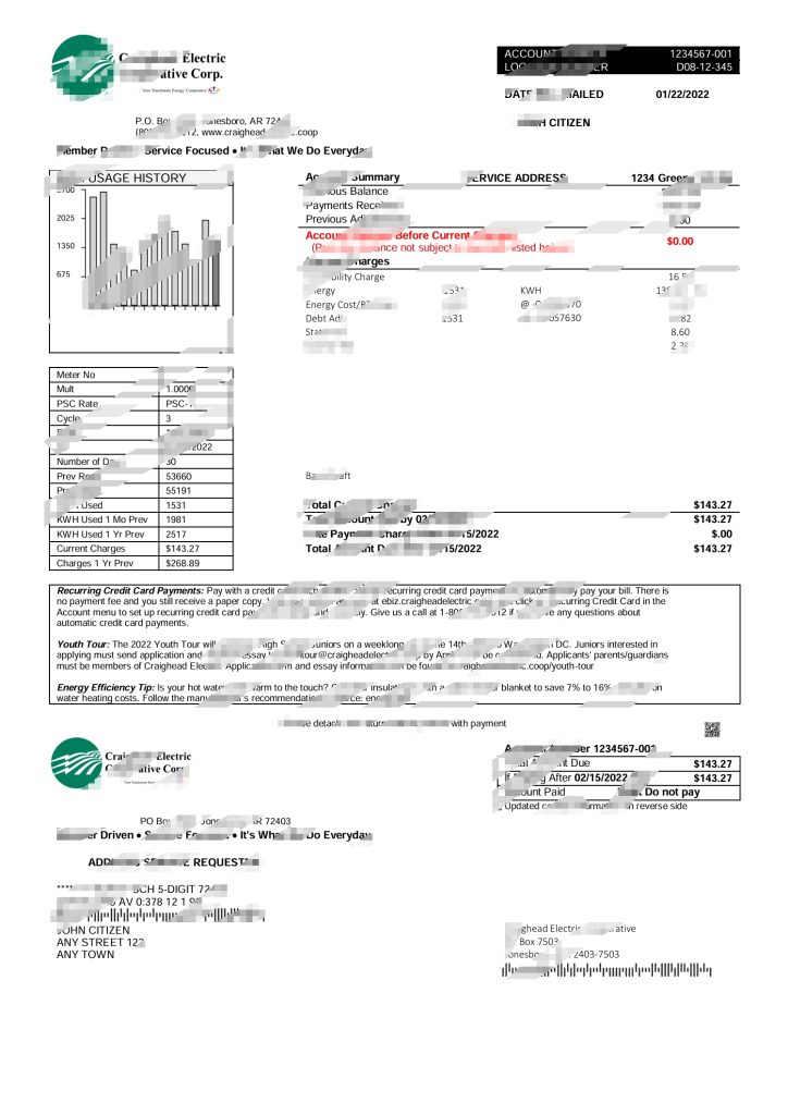 美国 Craighead 电力账单模板用途:
